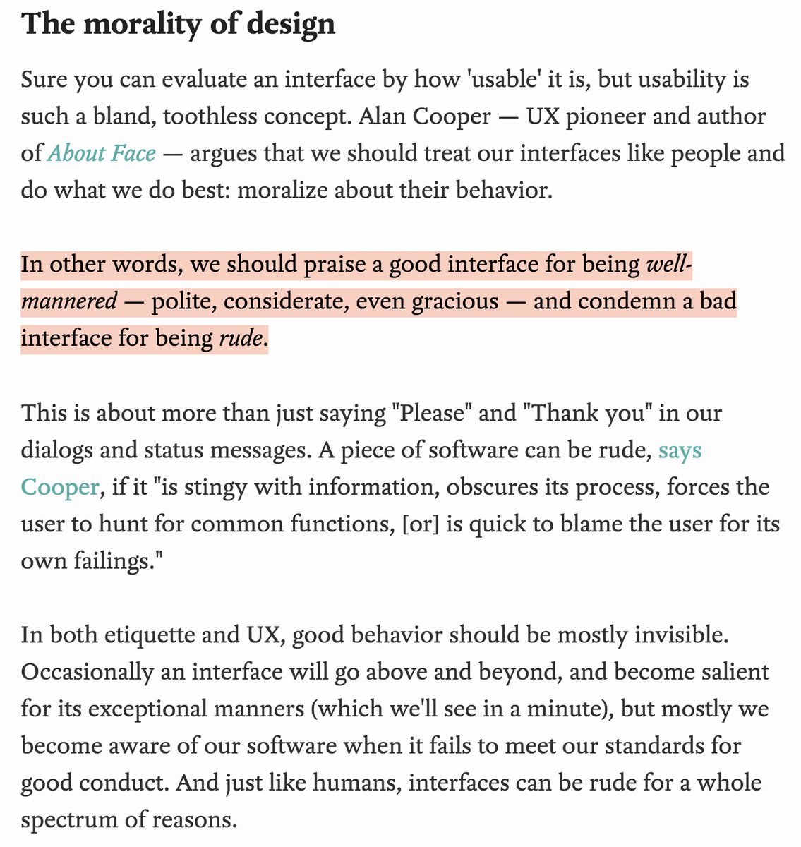 Would love to see this as a metric that products optimize for. How polite are you in demanding a users attention? Are your products interjections aggressive and rude? Reminds me of your thread on notifications and how they make you feel.