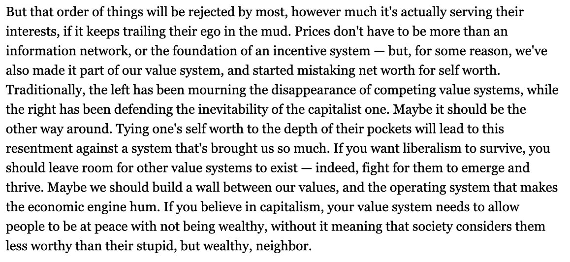 This worries me tbh. Because it is a synomonous statement to the view that nonfungibility and illegibility are key to social happiness and not being zero sum. And neither are things I believe are macro trending in that direction