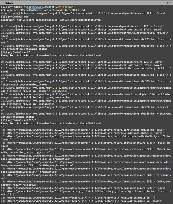 Typing "wtf" in Pry displays the top of your last exception trace. "wtf?!?" shows more. Pretty amusing @banisterfiendpic.twitter.com/kqdG6j0VQq