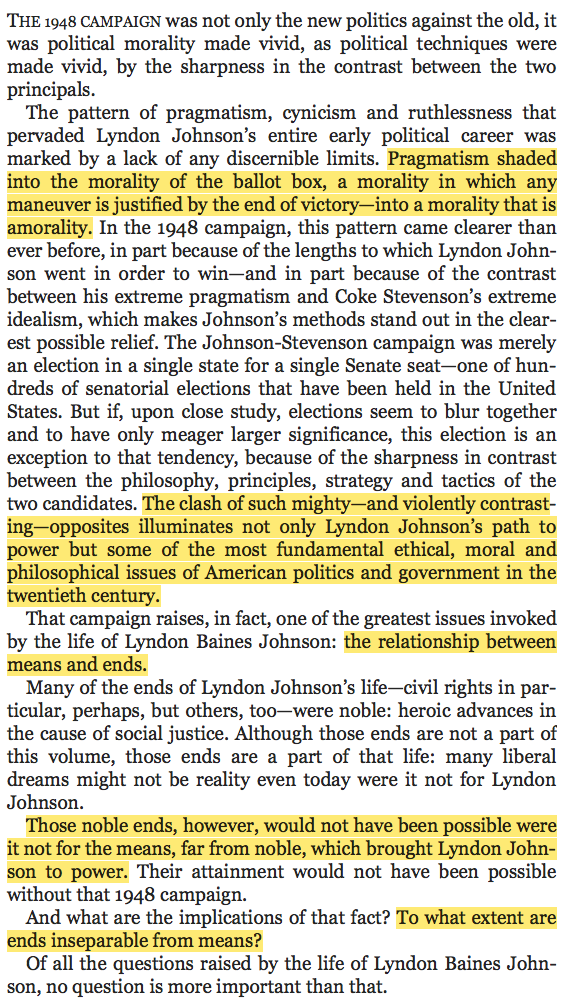 Robert Caro's books on LBJ give a detailed view into how noble ends in politics are inseparable from amoral means.pic.twitter.com/kM9YXHw1Vy