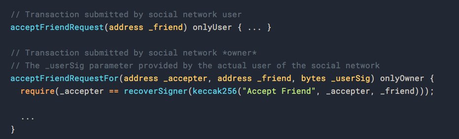 Attached screenshot is a concrete example for those that know a little bit of solidity. Basically, why does a user of a social network need to submit a TX saying they accept a friend request? Just use the private key to prove you accept and let the biz submit the TX for you.pic.twitter.com/8E9UGJc3I5