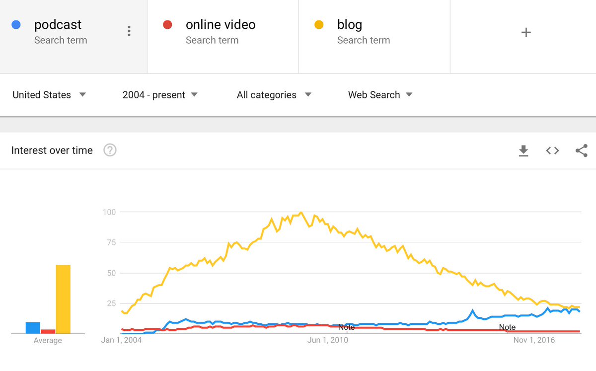 Interesting. My guess is it’s better understood as chasm crossing than hype cycle. In particular, I don’t think they ever had a hype phase (custom search 07-08). Also, ngram is interesting: podcasts as popular as blogs in 04!pic.twitter.com/5bjAJTgS2C