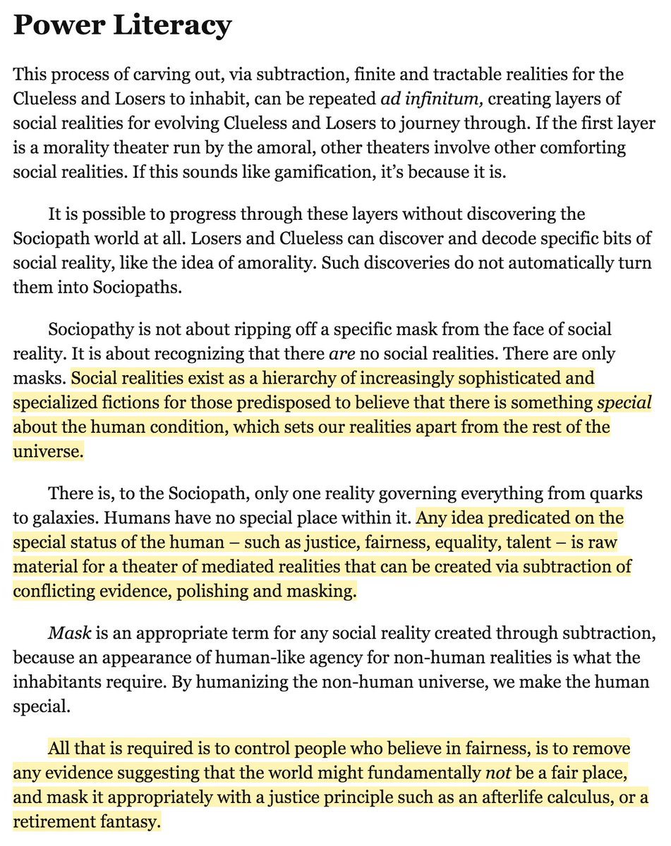 Power Literacy: "Any idea predicated on the special status of the human – such as justice, fairness, equality, talent – is raw material for a theater of mediated realities that can be created via subtraction of conflicting evidence, polishing and masking."pic.twitter.com/7eWlOxGZpc