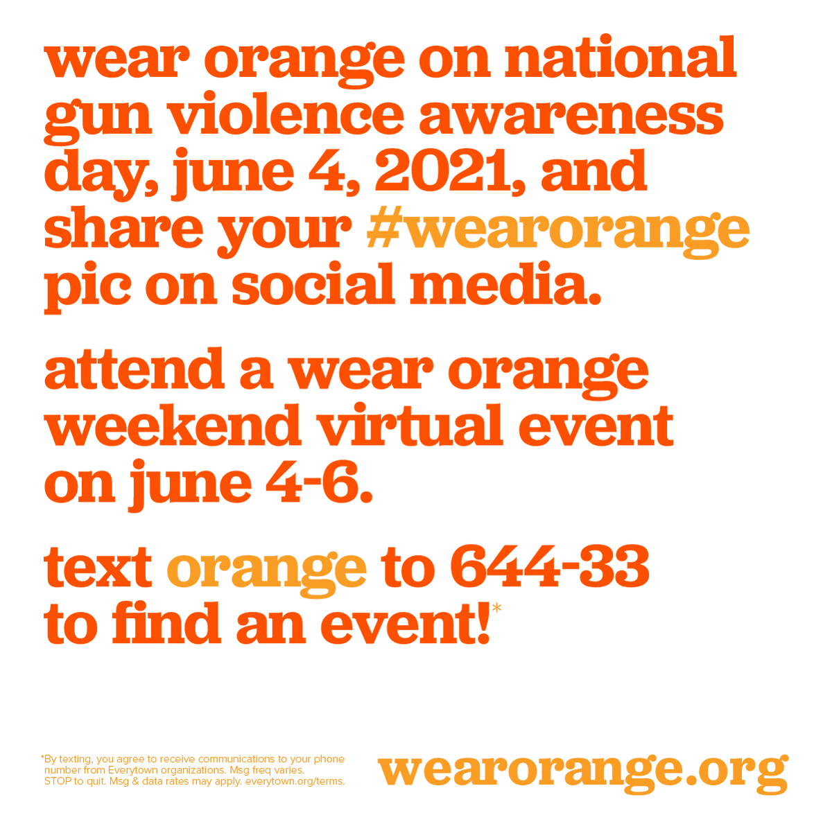 #WearOrange, when Americans come together virtually to show our support for victims and survivors of gun violence. Join us in advocating for common-sense gun safety and find an event in your state by texting ORANGE to 644-33!pic.twitter.com/6yXxpnxyKW
