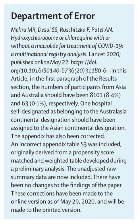 The Lancet has published a Correction to the paper by Mehra et al https://www.thelancet.com/lancet/article/s0140-6736(20)31249-6 … The results and conclusions remain unchanged. The Lancet encourages scientific debate and will publish responses to the study, along with a response from the authors, in the journalpic.twitter.com/9rL2YsTsfd
