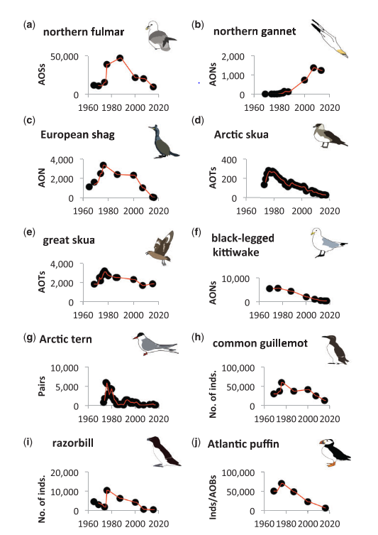 Incredibly depressing to see the population trends of seabirds breeding in Shetland. It must've been incredible visiting those colonies in the 1970s. This figure is from a super interesting paper I just read on the change of North Sea ecosystems: https://academic.oup.com/icesjms/article/76/4/925/5237030 …pic.twitter.com/zQaLqwDaBH