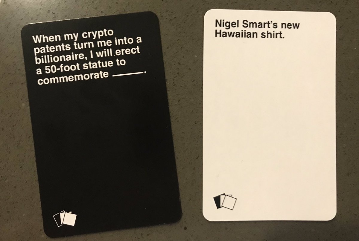 @SmartCryptology, I think this is a better play.#CardsAgainstCryptography#Asiacrypt2018pic.twitter.com/E1YgQoG87D
