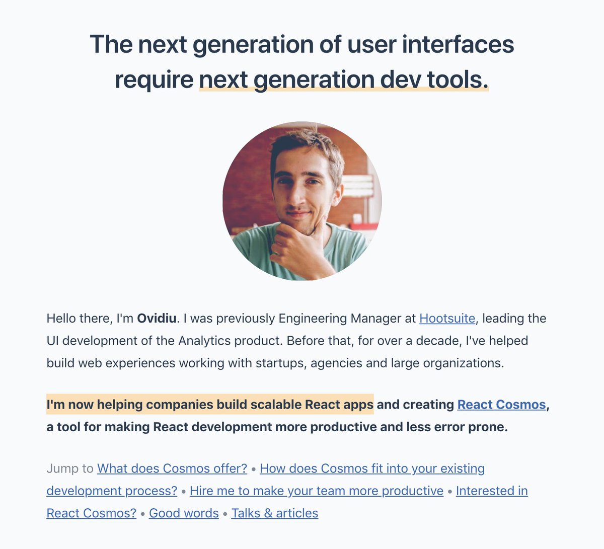 1y ago I kickstarted my consulting career with a tweet. Thanks to everyone who retweeted and the companies that hired me, I had a great year! Now I need you again... I'm doubling down on open source and dedicating fully to making React Cosmos awesome https://ovidiu.ch