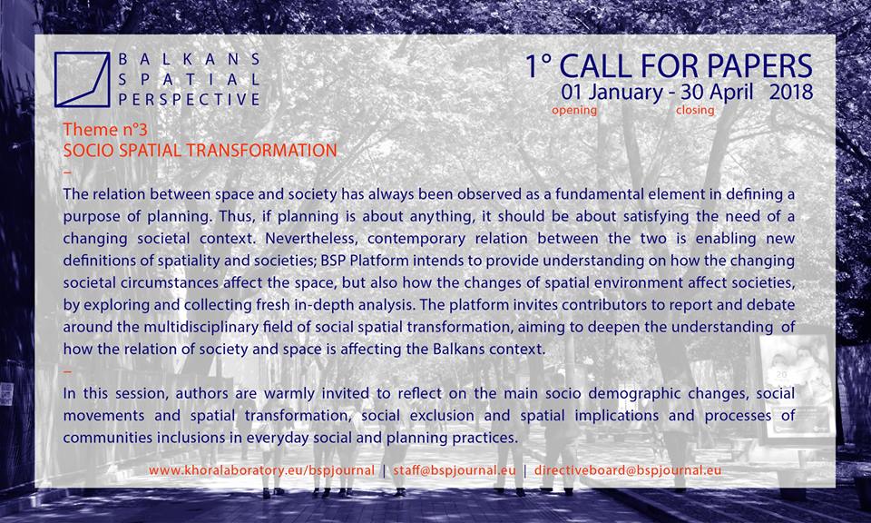 The third main issue we'd like to share with you is SOCIO SPATIAL TRANSFORMATION Call dates reminder [01 January / 30 April 2018] info at staff@bspjournal.eu http://www.khoralaboratory.eu/bspjournal/