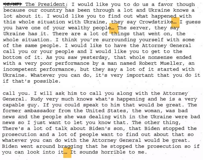 1. It's not a transcript. It's a memorandum, as circled. 2. The yellow markings, on the right, highlight ellipses, used to denote gaps in the conversation, all at points when Trump is making requests of Zelensky. There's no record of what Trump asked for.pic.twitter.com/itAhkEQa91