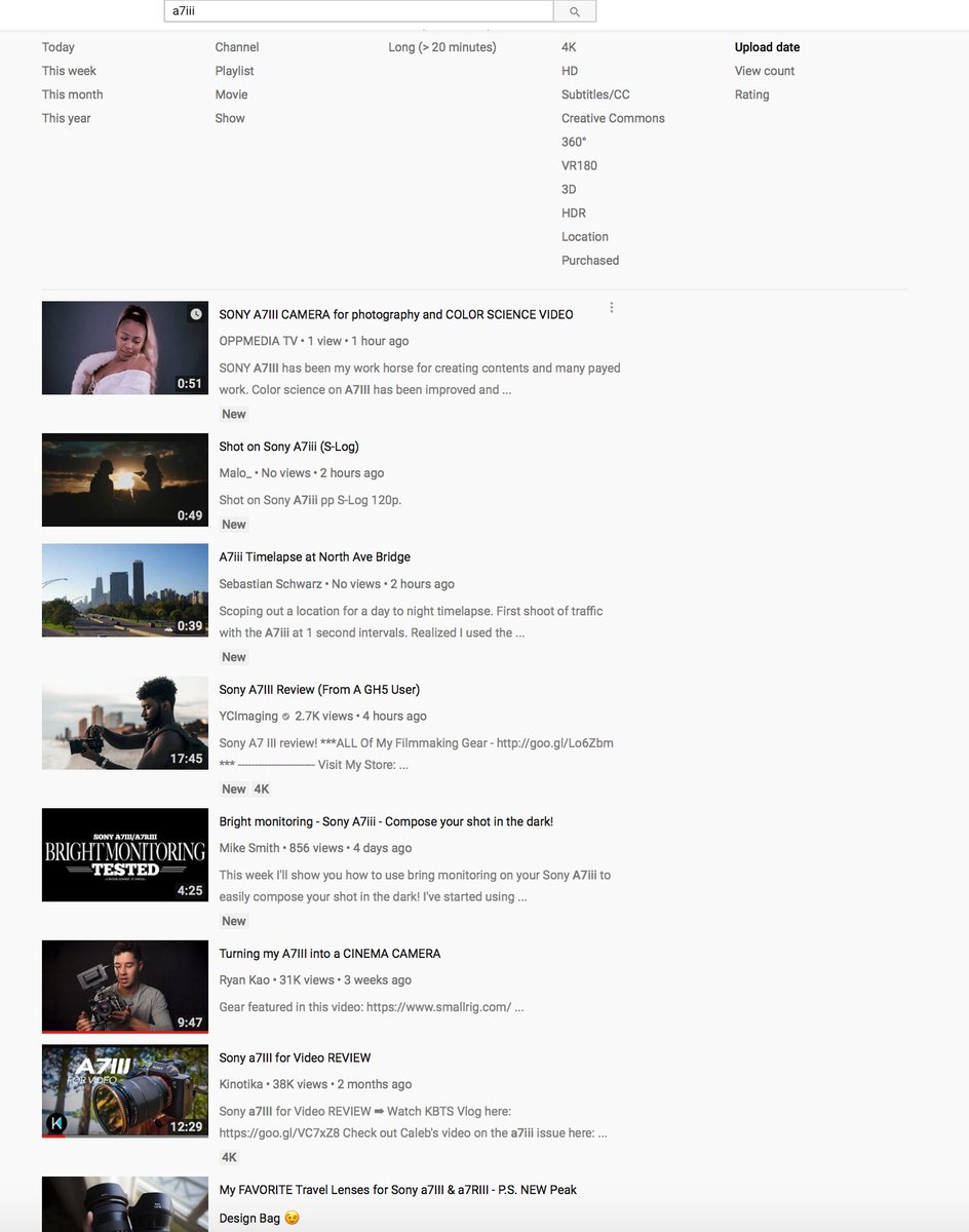 Cleared Cache on Chrome.Opened a new incognito window.Signed in back to YouTube. Searched A7iii.Sorted by Upload Date.Nothing changed.I still don't see the latest videos. It is a bunch of new videos and the 4th video is 3 Months old. No chronological order.pic.twitter.com/9nwgTQhiBR