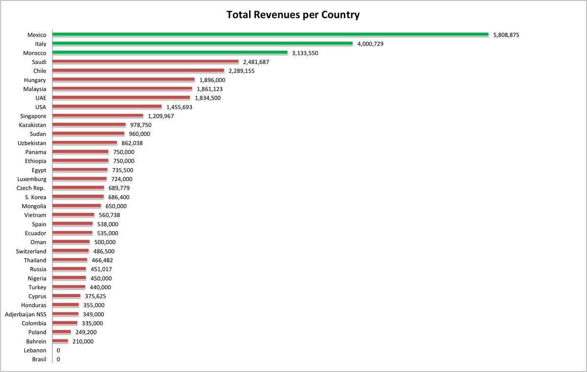 #HackingTeam revenues per country. Over €3 million and you get coloured in green.pic.twitter.com/uKbqTflUqw