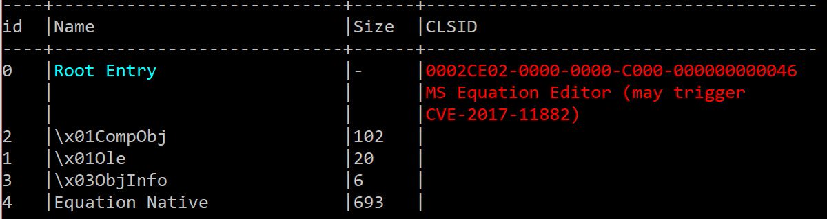 #oletools 0.53dev1: oledir now displays the tree of storage/streams, along with CLSIDs and their meaning. Known-bad CLSIDs such as MS Equation Editor are highlighted in red. (work in progress) https://github.com/decalage2/oletools/wiki/Install#how-to-install-the-latest-development-version … #DFIR #malwarepic.twitter.com/8vx1ZB12oH