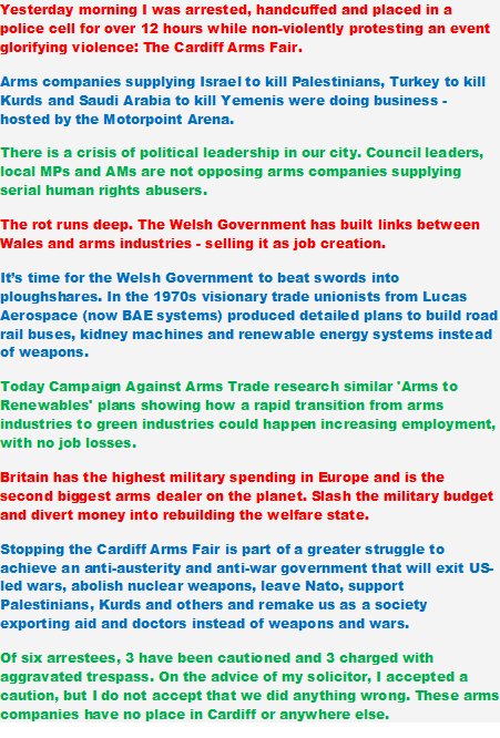 My statement on being arrested at the Cardiff Arms Fair protest yesterday morning. Please RT!pic.twitter.com/W4xW0T9oHq
