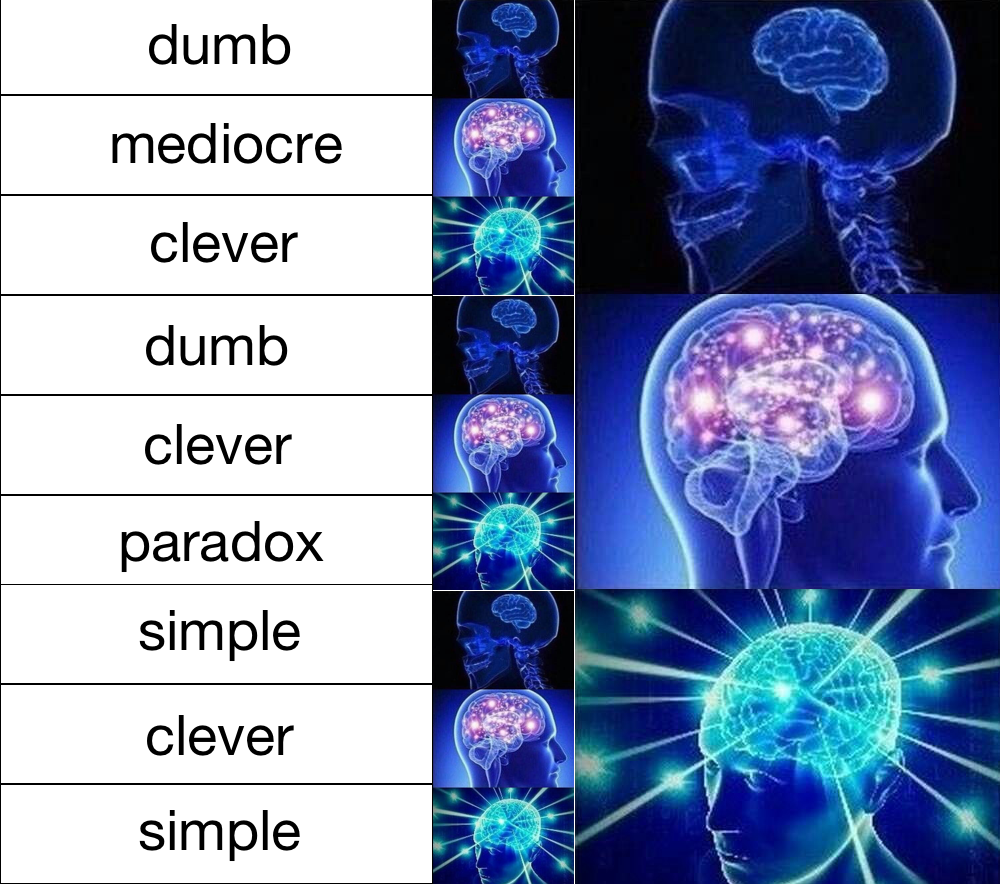 apropos of nothing: that "galaxy brain" meme has undergone on a curious evolution over the past few months; from [dumb → mediocre → clever thing] via [dumb → clever → paradox] to [simple → clever → simple]; in other words it has become DIALECTICAL at the meta level.