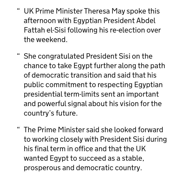 Theresa May has just congratulated military dictator President Sisi on his re-election and the chance to take