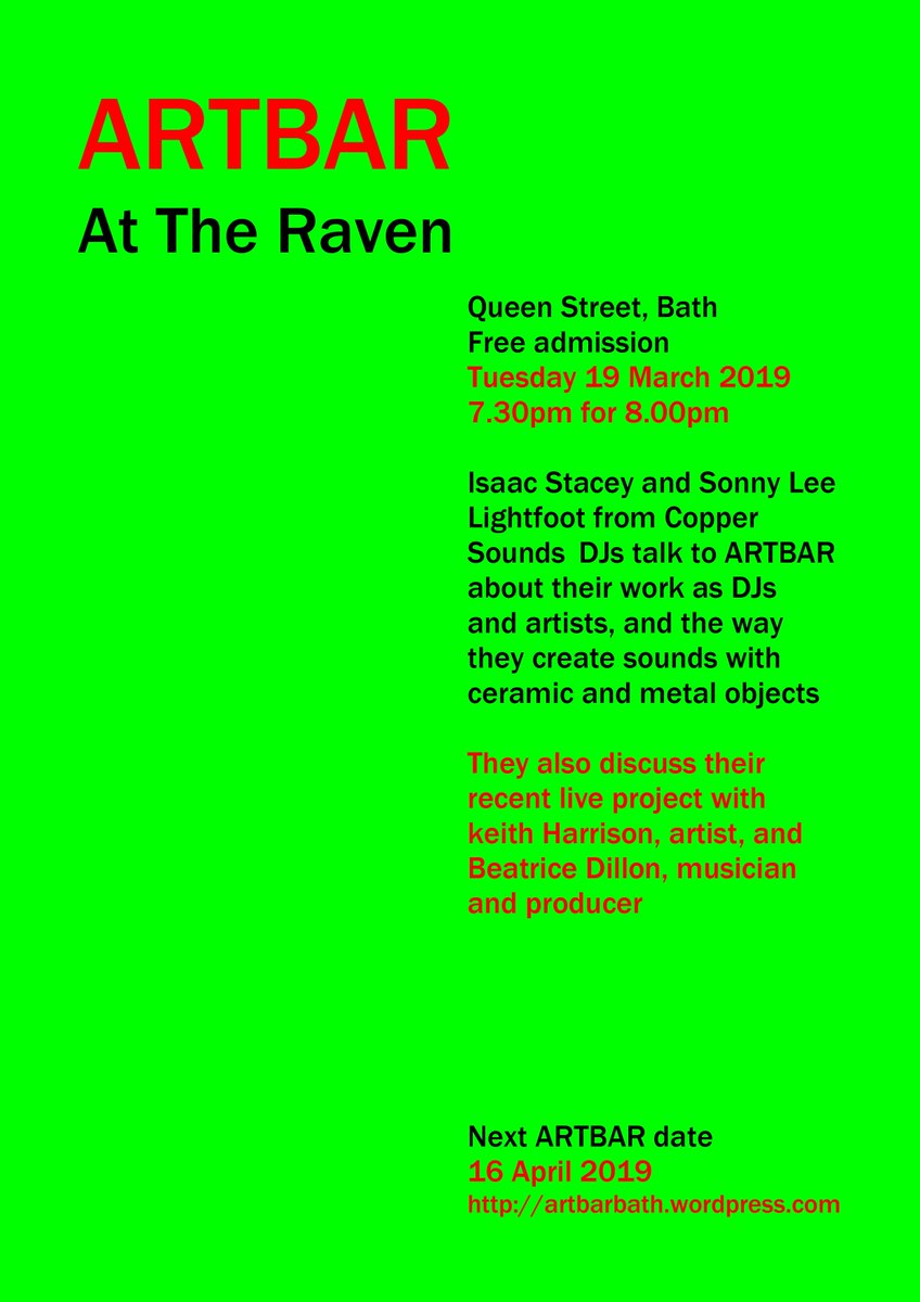 #Artbar@theravenofbath Tomorrow night Copper Sounds DJs#experimental music @SharpV50@thewiremagazine@EdgeArtsBath@RealWorldStudio@ResonanceFM@Bathfestivals@bathdigital@BristolBEEF@artbarbristol@ExSoSociety@soundandmusic@wiltshiremusicpic.twitter.com/bhgBJ0PB7d