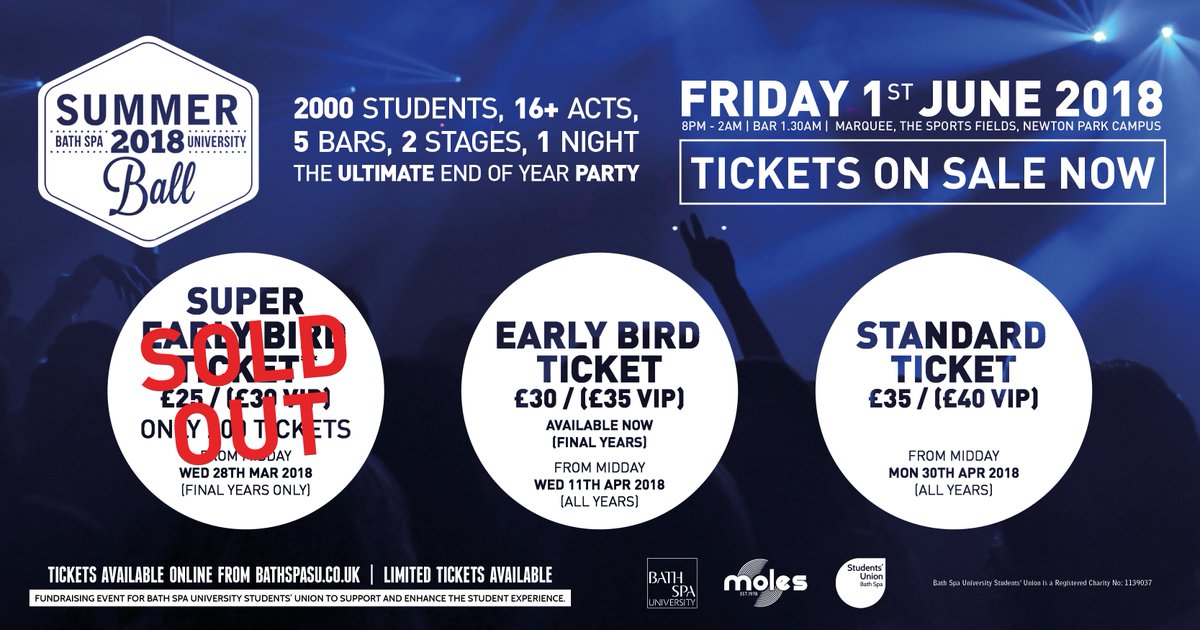 **SUPER EARLY BIRD tickets have SOLD OUT!** EARLY BIRD tickets are NOW ON SALE to FINAL YEAR students. GET THEM NOW!! https://www.bathspasu.co.uk/events/6013/891/ … VIP RECEPTION TICKETS still AVAILABLE!! LIMITED TICKETS AVAILABLE GENERAL SALE to ALL YEARS is MIDDAY, WED 11TH APR 2018.pic.twitter.com/jgfh8qKWTX
