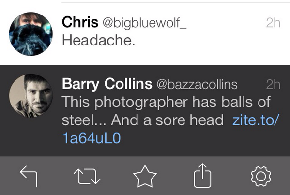 @bazzacollins: This photographer has balls of steel... And a sore head http://zite.to/1a64uL0Thanks. Twitter will use this to make your timeline better. UndoUndo