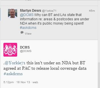 Interesting. Maria Miller on @DCMS Q&A says BT has agreed to publish fibre rollout data. Will it? (cc @RichKnowles)