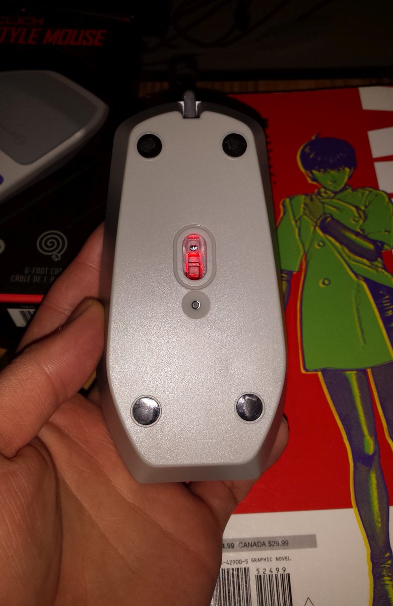 A nice little bonus feature on the underside, it has a button to cycle between the 3 speed/sensitivity settings. The original SNES mouse had 3 speeds as an internal setting, but you could only switch between them if the software provided a user interface for it. #SNESMousepic.twitter.com/Lz69A3HDgv