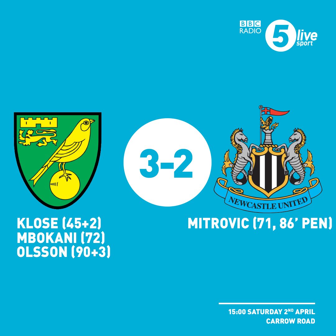 #NCFC 3-2#NUFC Last gasp win for Norwich! 'What a win for Norwich, but surely Newcastle are down' Sutton pic.twitter.com/ceHCed88NQ