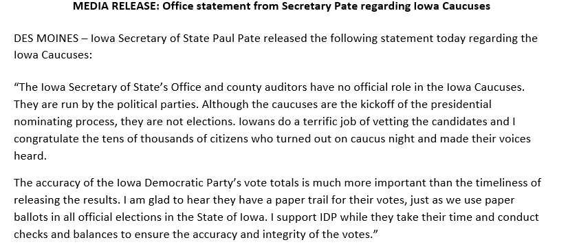 @IowaSOS says: "I support IDP while they take their time and conduct checks and balances to ensure the accuracy and integrity of the votes.” (As@brianneDMR noted, Republicans and Democrats are uniting, as they have before, to defend the caucuses.)pic.twitter.com/jEMqftFrG6