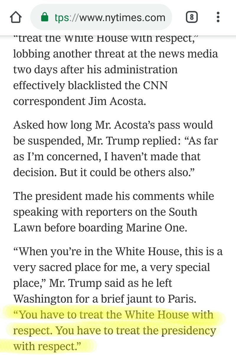 川普把CNN记者放在黑名单(不允许参与白宫新闻会)。前几天川普威胁要把更多记者放在黑名单,条件是"他们必须尊敬总统" 让我们想起川普今年六月对金正恩表示敬佩说 "当金正恩说话他的人民坐好听好,我希望我的人民也如此。" 渴望做独裁就在这个人的骨子里。美国人要警惕! https://www.nytimes.com/2018/11/09/business/media/trump-retaliation-reporters-april-ryan.html …pic.twitter.com/X3fXmUr7RO