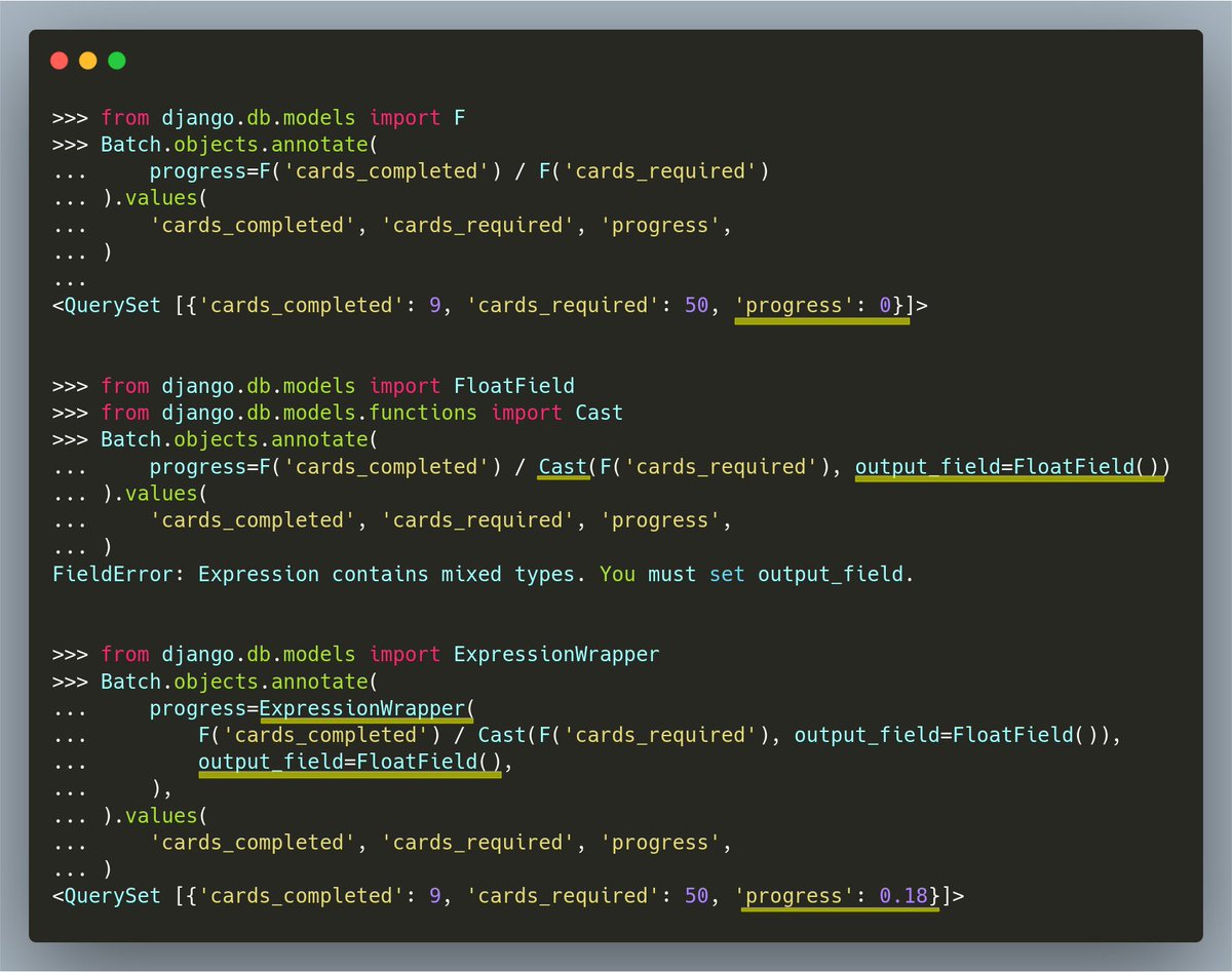 How to add a calculated percent field to a #Django QuerySet? Not so simple... This is why https://hakibenita.com/sql-dos-and-donts#be-careful-when-dividing-integers …pic.twitter.com/Tr8E5X9eTR