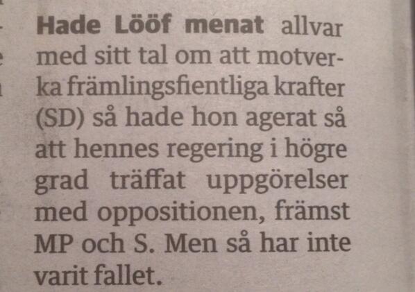Lööf menar ej allvar med att motverka främlingsfientliga. Alliansen har ej gjort upp med MP. DD idag. Suck.pic.twitter.com/UXH5r4h72i