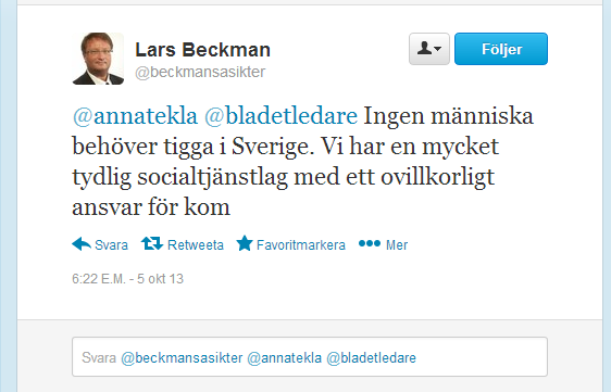 @annatekla@bladetledare Ingen människa behöver tigga i Sverige. Vi har en mycket tydlig socialtjänstlag med ett ovillkorligt ansvar för kom -