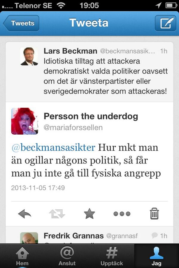 @mariaforssellen Vi kan debattera i sociala medier, och i tidningar mm, 24/7 och gärna tillsammans mot rasister i sd, men våld är aldrig ok