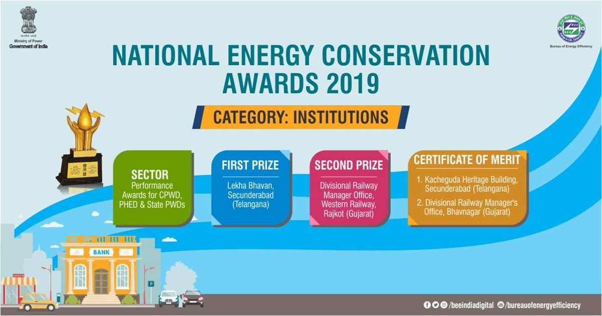 In the Performance Awards for CPWD, PHED & State PWDs sector, the 1st prize was given to Lekha Bhavan, Secunderabad. Bureau of Energy Efficiency congratulates all the winners of the National Energy Conservation Awards 2019.
