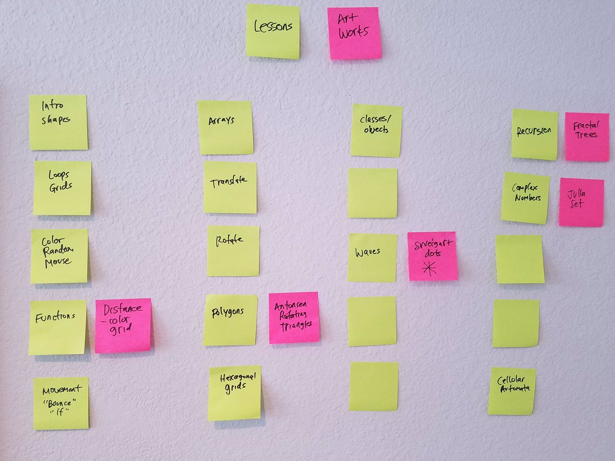 #art #math Twitter: I’m putting together an Art-Math-Programming course at my school and we’ll study (and attempt to clone) a different work of Computer Art each meeting. Here’s the grid so far. Topics in yellow, artworks in pink. Suggest more topics and artworks! 1/2 #iteachmathpic.twitter.com/rqSIwUawKr