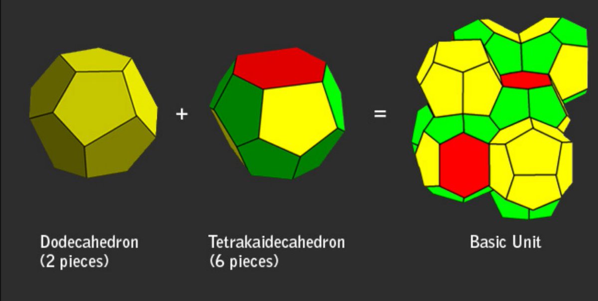 What was the most efficient bubble foam? The Weaire–Phelan structure using an irregular dodecahedron with pentagonal faces, and a tetrakaidecahedron (truncated hexagonal trapezohedron) discovered in 1993 is a better solution of the "Kelvin problem". #threadpic.twitter.com/6xTiuZwh34