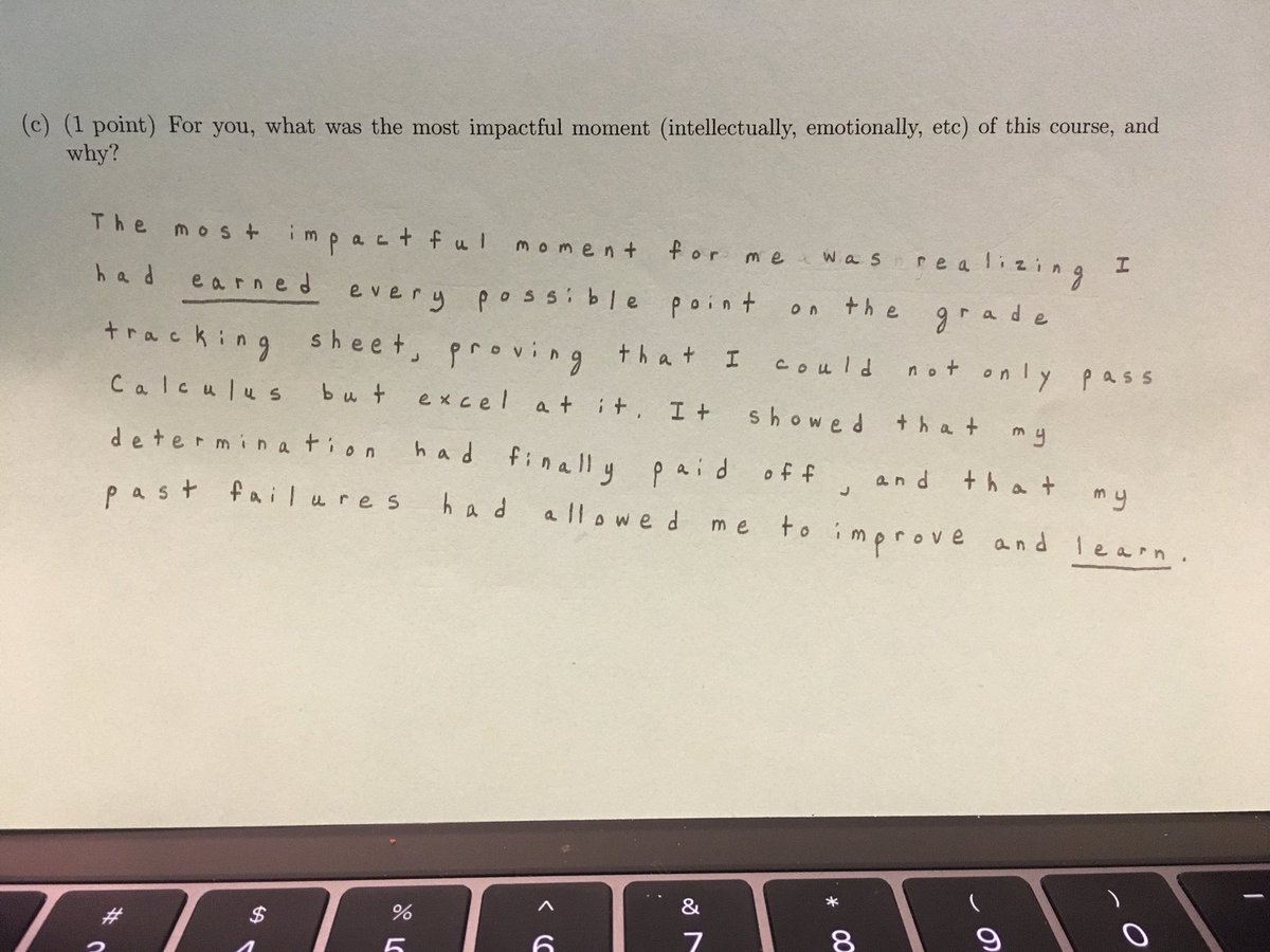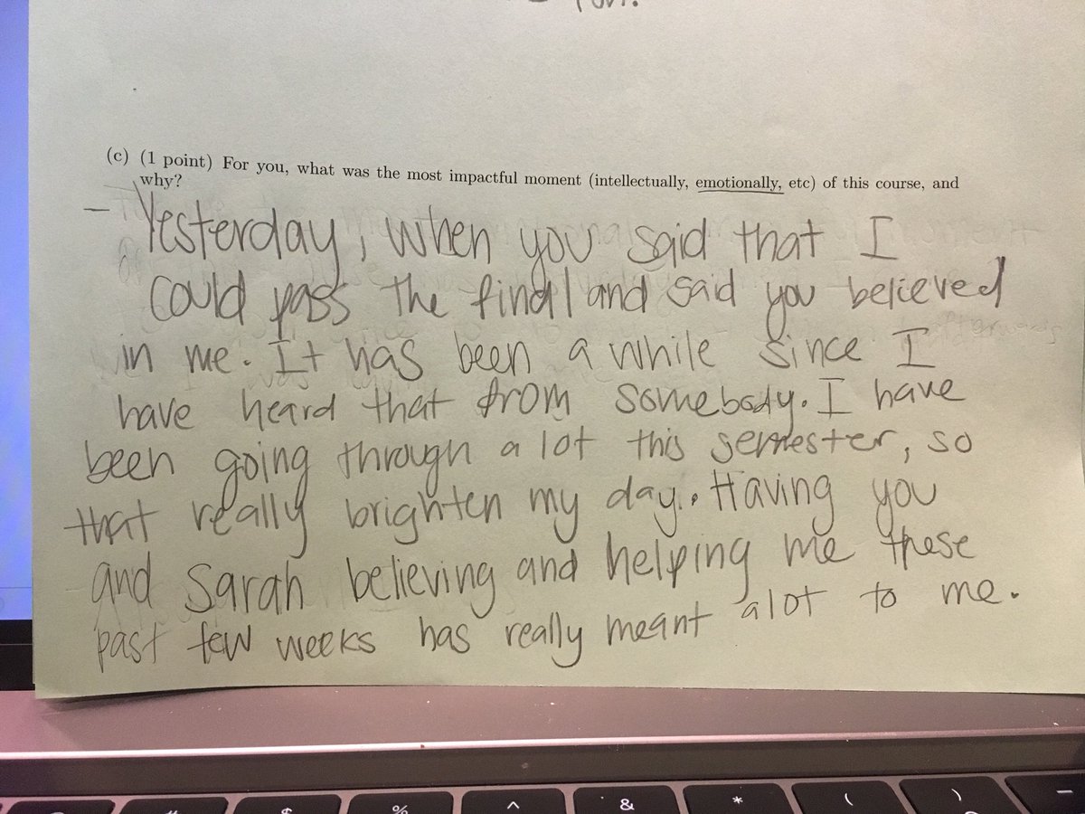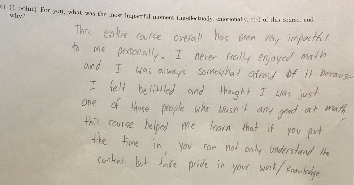 So glad that I stole reflective questions from @mathyawp to put at the end of my final. The ways that we set up our courses, and the things we say to students... these things really matter.pic.twitter.com/QVmG5NfPjb