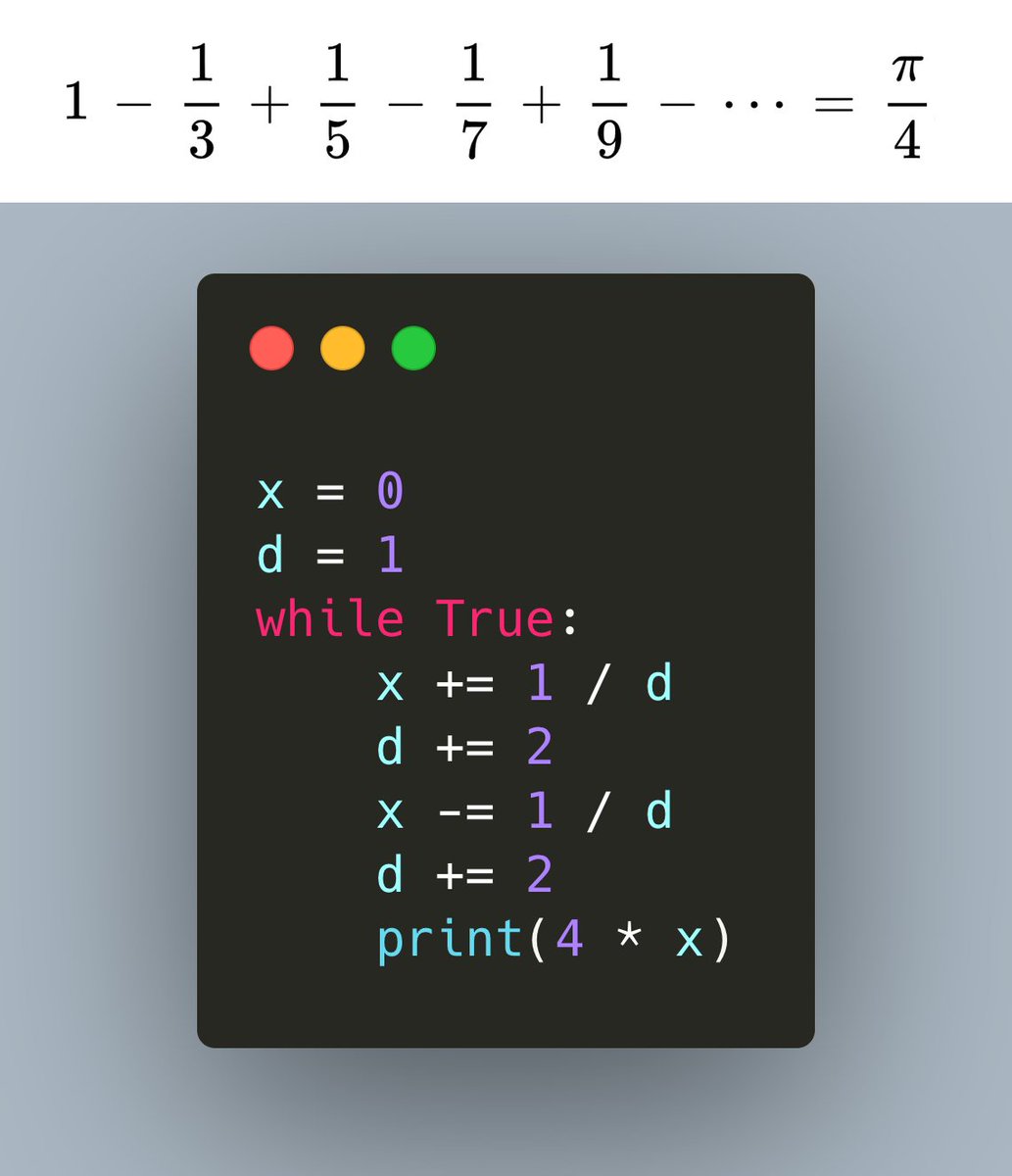 This one always blew my mind. The Leibniz formula for π. 1 - 1/3 + 1/5 - 1/7 + 1/9 ... = pi / 4 So, this Python code approximates pi. https://en.wikipedia.org/wiki/Leibniz_formula_for_%CF%80 …pic.twitter.com/BSAbqhmWaa