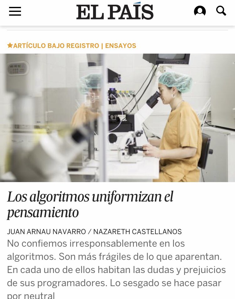 Hoy se publica en El Pais un artículo que hemos escrito el filósofo Juan Arnau y yo sobre la huella que deja el investigador en lo investigado, y la ilusión de la objetividad. El Pais, 26 de enero. Los algoritmos uniformizan el pensamiento.pic.twitter.com/PaeXMVqtI3