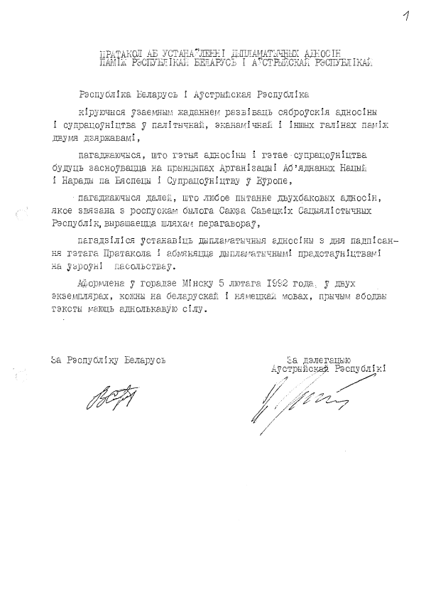 Беларуска-аўстрыйскі пратакол аб устанаўленні дыпламатычных адносінаў быў падпісаны ў Мінску 5 лютага 1992 года || Am 5. Februar 1992 wurde in