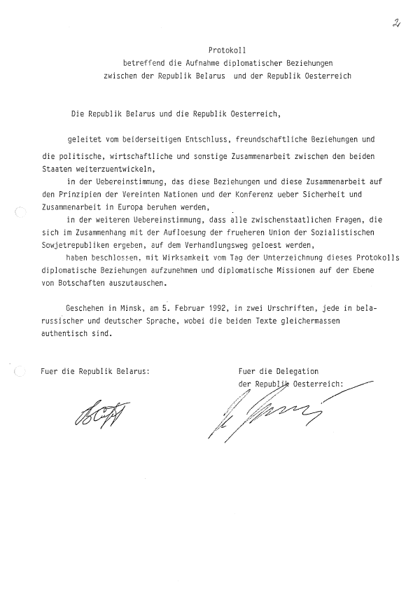 Беларуска-аўстрыйскі пратакол аб устанаўленні дыпламатычных адносінаў, Мінск, 5 лютага 1992 года || Protokoll betreffend die Aufnahme