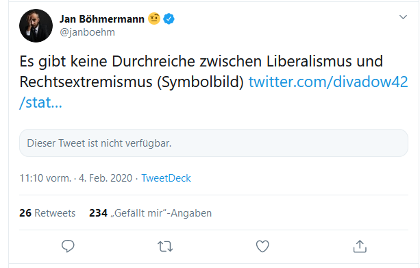 "Wie können wir verhindern, dass Linkspopulisten[...] „die Mitte“ definitorisch so weit nach links verschieben, dass am Ende keine Mitte mehr vorhanden ist und so ein Konjunkturprogramm für rechte und linke Extremisten schaffen?"https://www.cicero.de/innenpolitik/jan-boehmermann-twitter-fdp-martin-sellner-rechtsextremismus …