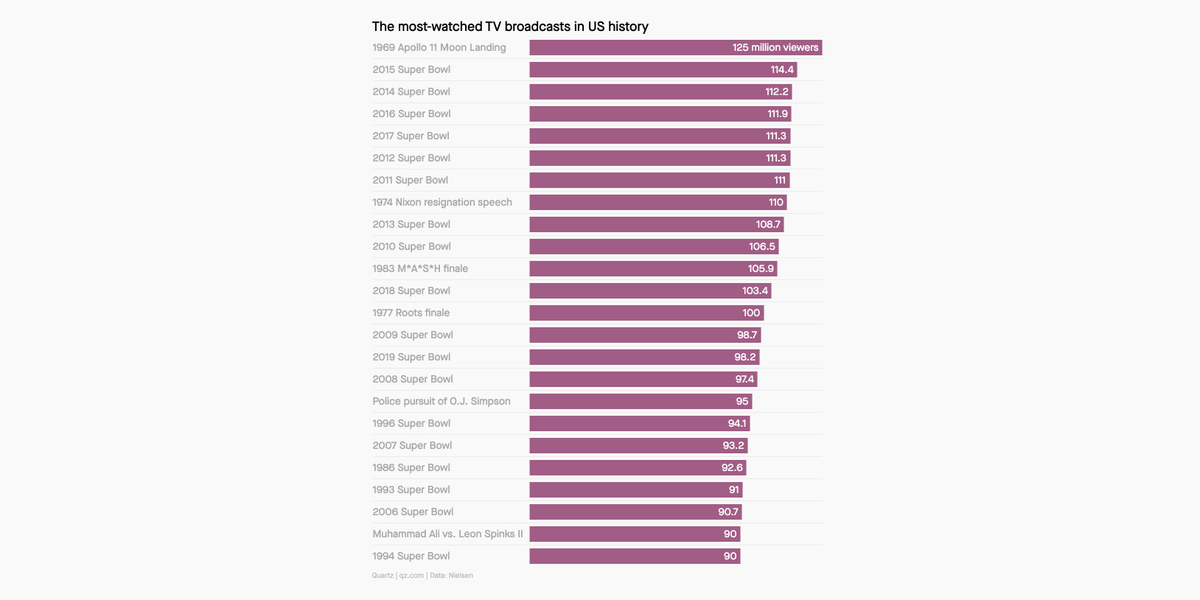 Remarkable look at shared experience/pop culture in this chart of most-watched TV broadcasts in the US… https://qz.com/1794113/how-the-nfl-super-bowl-became-a-cultural-phenomenon/ …pic.twitter.com/P1EIxwxrLa