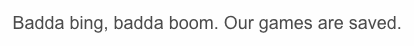 @david_laskey @benedictfritz no, he's lying. if it was REALLY David it would end with. "Saved Game? Hardly knew her!"