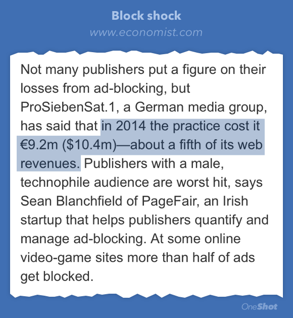 Uninstalled my adblocker on a whim last week, but wow, had no idea how much money was involved http://www.economist.com/news/business/21653644-internet-users-are-increasingly-blocking-ads-including-their-mobiles-block-shock …pic.twitter.com/3hKgrPZBI1