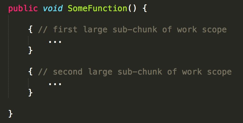Important code principle: Have a long, complex function? Resist the urge to just arbitrarily split it up into shorter one-use functions.