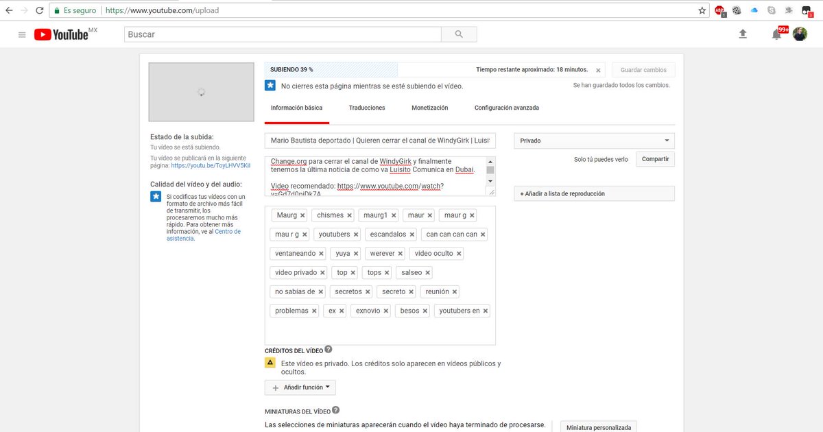 Mi video lleva 39% de subida en YouTube y no avanza :( eso me pasa por exportarlos en la más alta calidad posible, pesa 5GB.