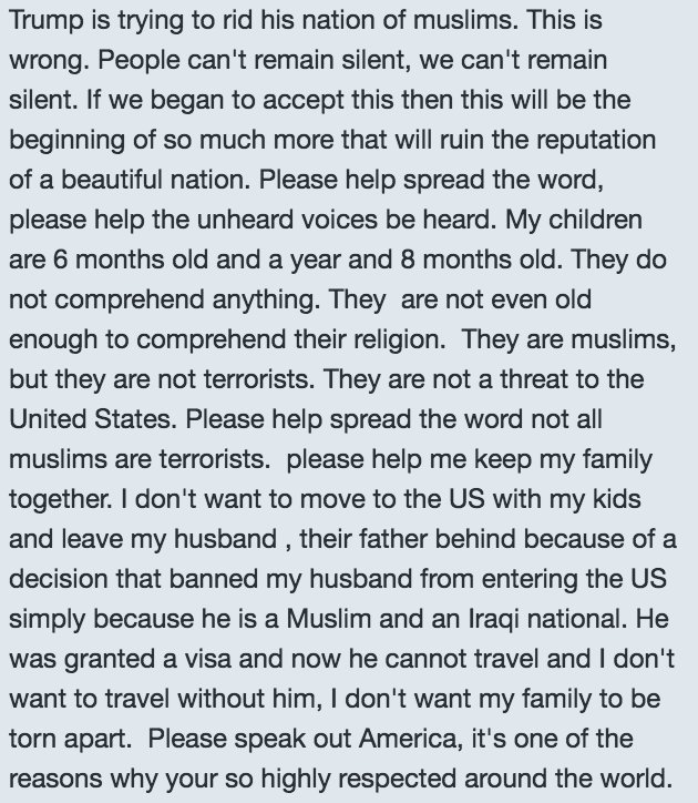 Let me share some of the stories I have received today from people under the travel ban. This from an Iraqi Kurdish womanpic.twitter.com/qHd3viHFQO