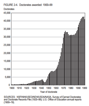 The GI Bill was the beginning of the transformation, not the end. PhD production tripled from prewar levels in the time of the GI Bill, then leveled off for a bit, then tripled again throughout the 60s:pic.twitter.com/OtyVvtfqrs