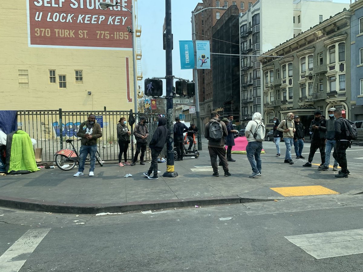 This is Turk and Hyde sts. in #SanFrancisco this afternoon. I count 12 drug dealers in this pic. How many are repeat offenders? Why do we allow this? Every one of these dealers is selling illicit Fentanyl. @MattHaneySF @LondonBreed @beyondchron @SFPDChief @SFDAOfficepic.twitter.com/HQlqLPx0eH
