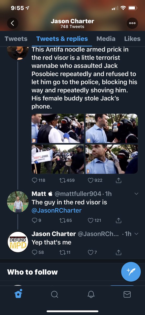 Here is the profile of the lead agitator 'Jason R Charter' who is on video violently assaulting police and @JackPosobiec. Mr. Charter has multiple tweets claiming responsibility for the assault. Are Antifa criminals held accountable? We will see...pic.twitter.com/AngcsAvybv